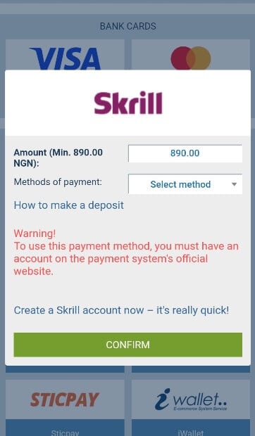 Please note that you do need to have a verified Skrill account to use this service. Furthermore, the minimum deposit amount is ₦890, which is higher than local bank transfers. On the upside, 1xBet doesn’t charge any processing fees.